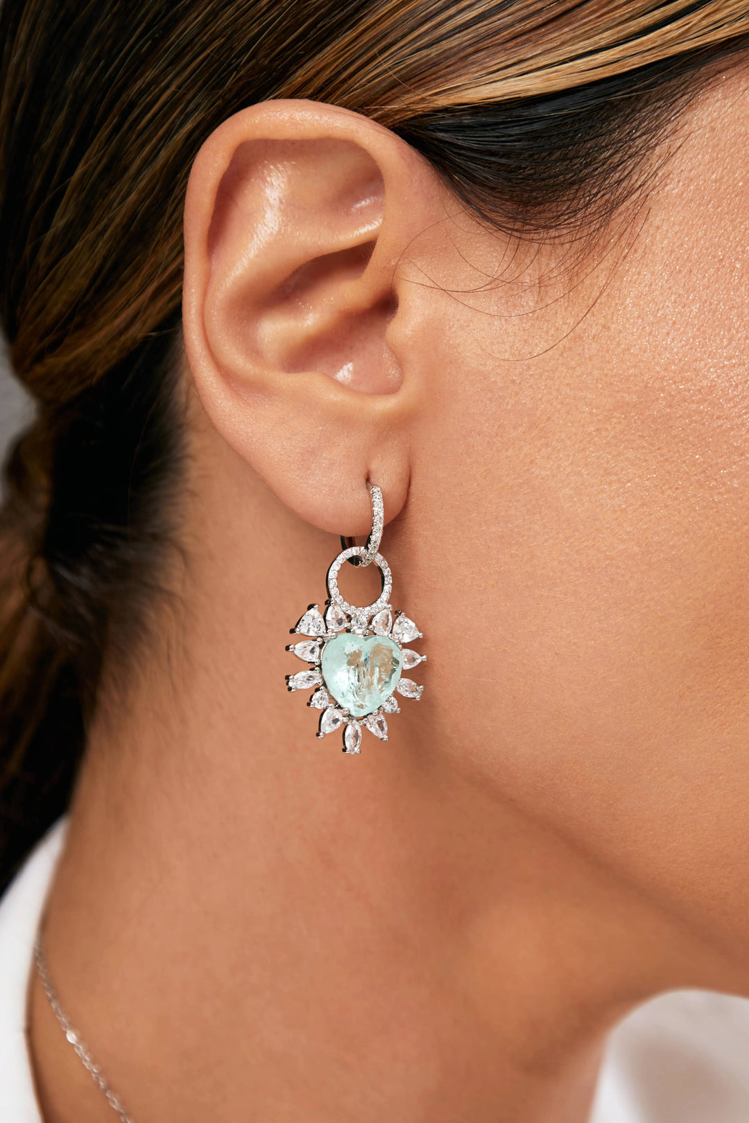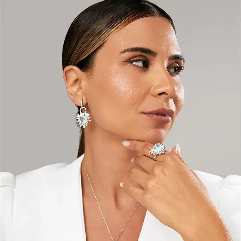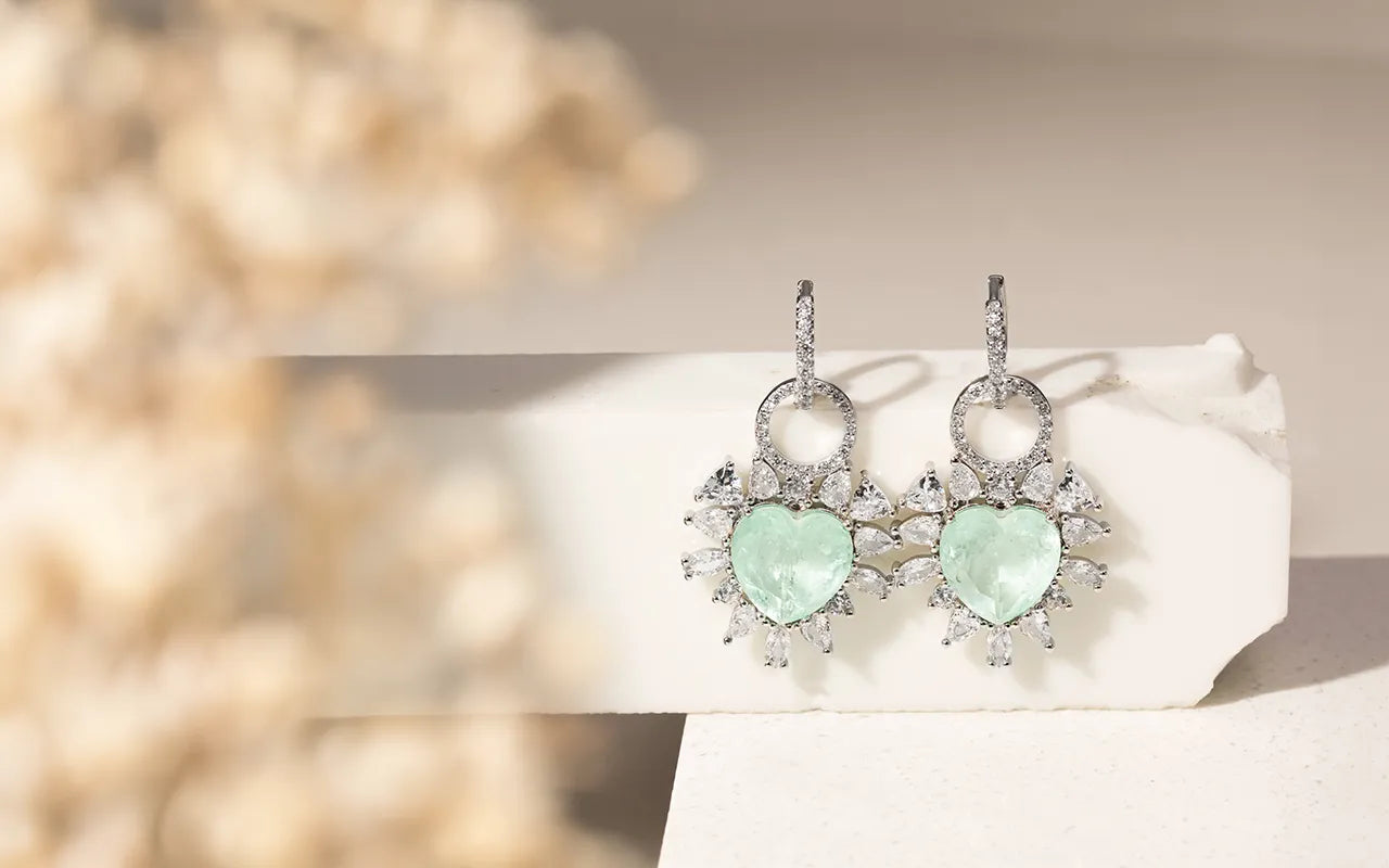 Experience the stunning fusion of vivid Colombian emerald and radiant rhodium plating with our Sparkling Heart Earrings. Feel the energy and passion of these exquisite earrings, perfect for the upcoming gatherings and parties. A true luxury for those who appreciate unique jewelry. Elevate your style and make a statement at the parties.
