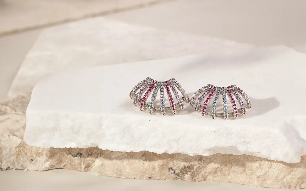 Bright Multicolour Cubic Zirconia Ear Cuff Earring, Rhodium Plated