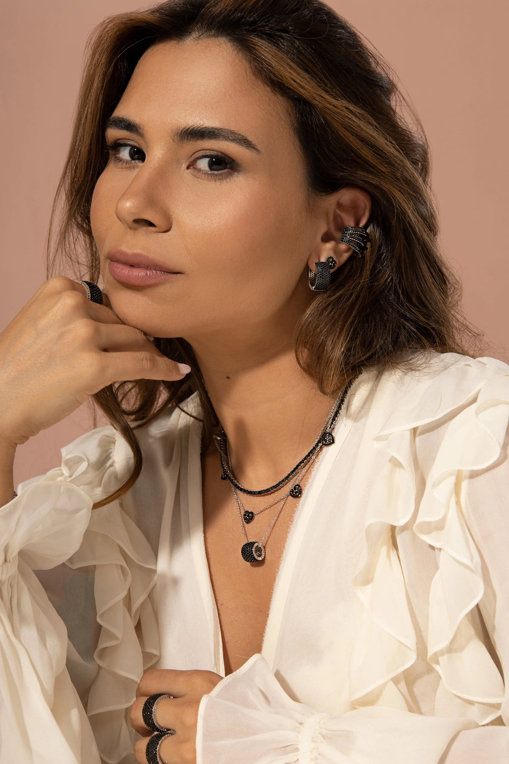 Chic layered necklaces on a woman in a lace top, featuring Elladora's sleek sterling silver and bold gold pieces, epitomizing luxury and versatility.