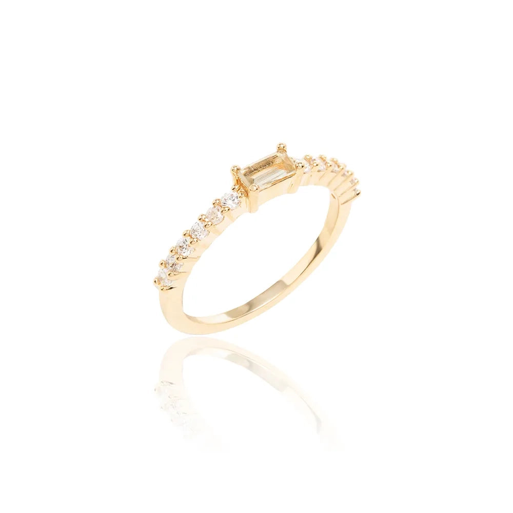 Elegant in its simplicity, the Bright Beryl Crystal Half Band Ring embodies modern refinement. Showcasing a clean baguette-cut centre stone complemented by a delicate half band, this design delivers understated sparkle and contemporary sophistication, ideal for stacking or making a subtle statement on its own.