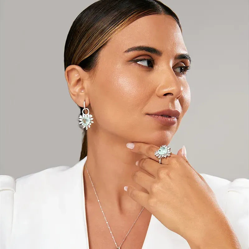 The Colombian emerald and white crystal fusion, rhodium-plated, offers an impeccable combination of superior quality and stunning brilliance, creating a piece of unmatched elegance and exceptional durability, perfect for those seeking luxury and sophistication in every detail.