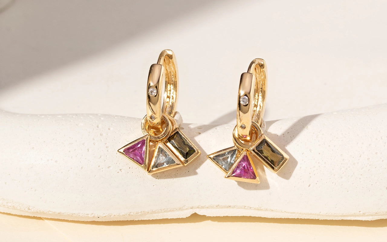 Bright Geometric Charms Hoop Earrings 14mm, petite gold-filled hoops with playful geometric charms in pink tourmaline, peridot and London blue tones. Colourful, chic and effortlessly eye-catching.