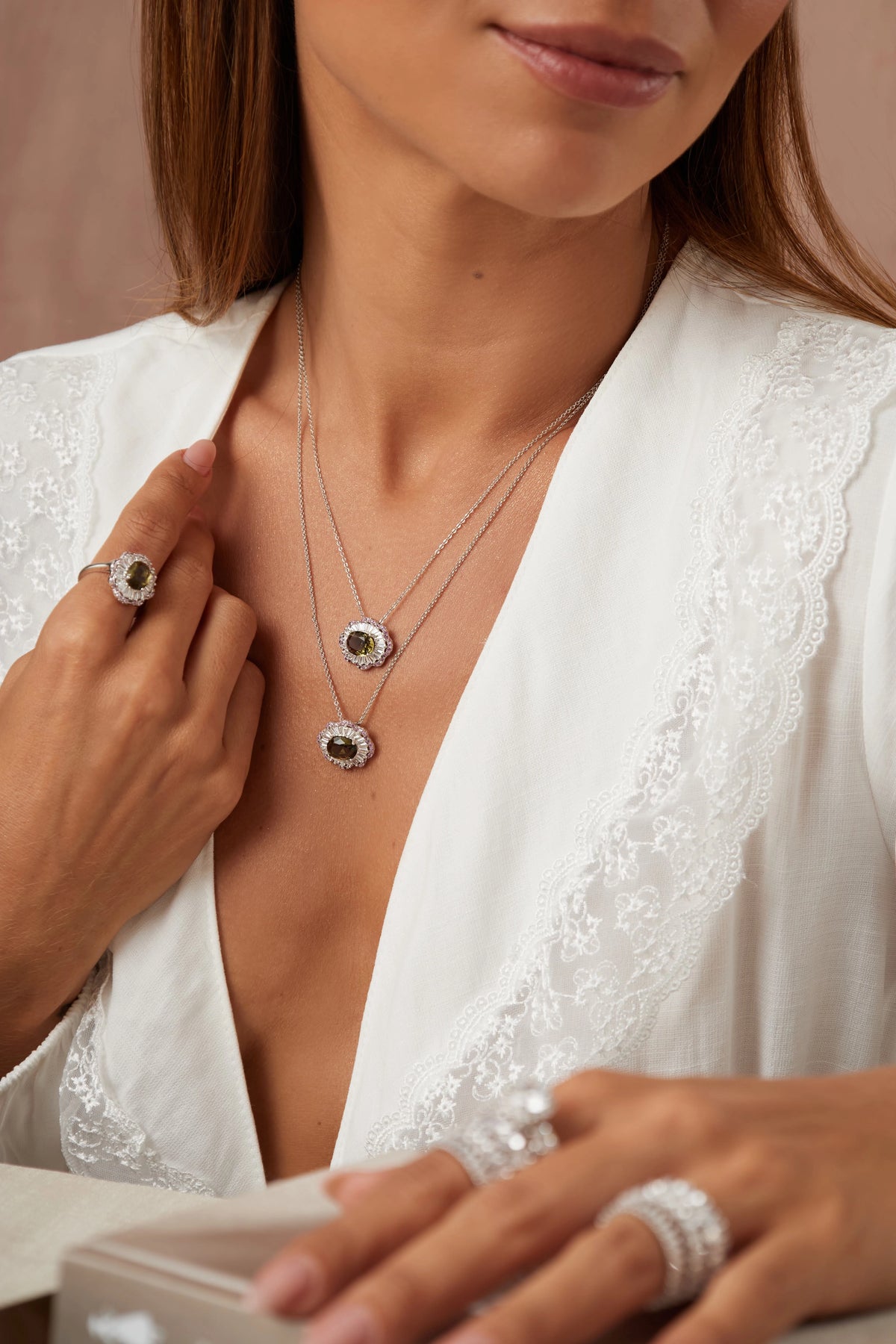 Bright Oval Peridot Crystal CZ Halo Ring, a graceful oval peridot-tone centre stone framed by a halo of sparkle, bringing a fresh, luminous pop of green to the hands. Feminine, elegant and eye-catching.