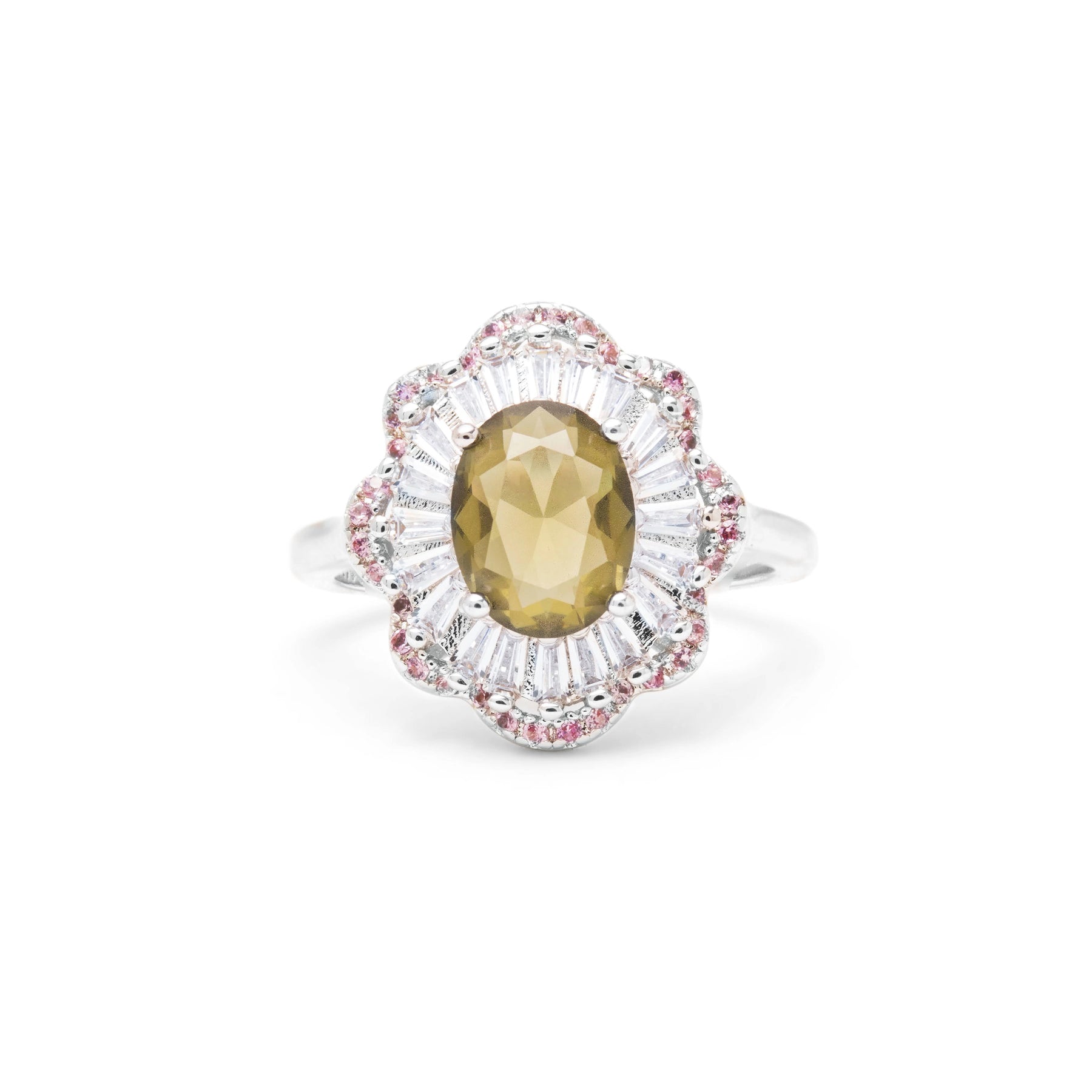 Bright Oval Peridot Crystal CZ Halo Ring, Rhodium Plated